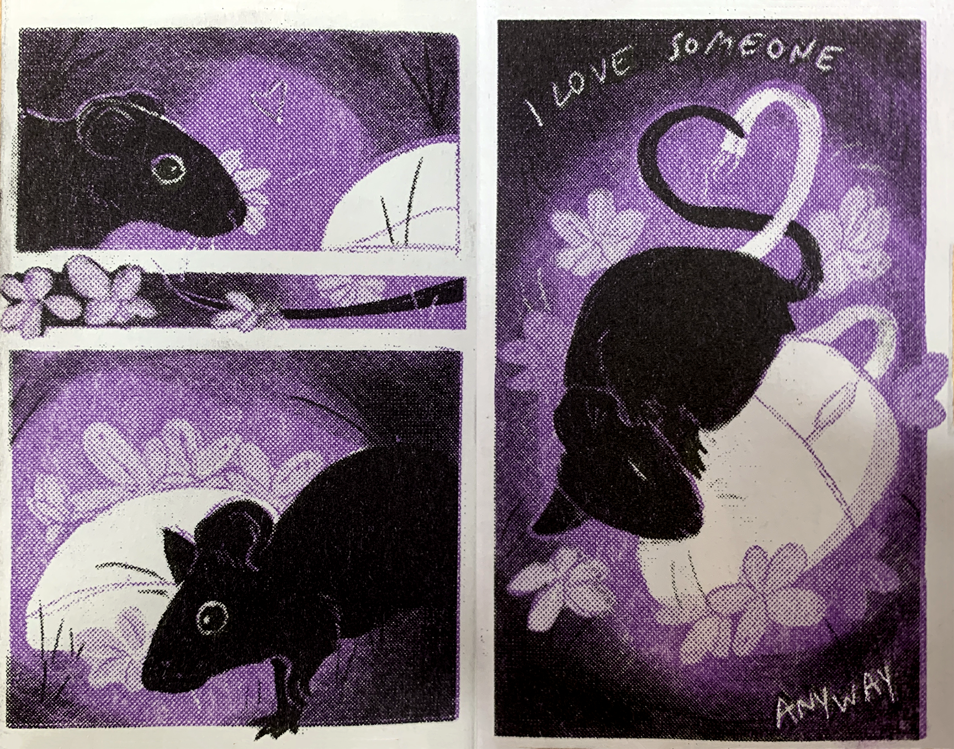 A poem and risograph comic about mice and love. 2.75 x 4.25in mini-zine. Selected for the Washington University Student Work Archive in 2024.